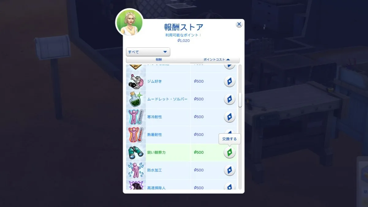 たまった報酬ポイントを使って、今後出会う父親シム候補に備えて「鋭い観察力」の報酬スキルをゲットしました。