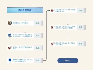 今回のクエストはストーリーに加えて、ワールドにクエストに関わる新たなシムが追加されます。今までも名前だけは出てきていたのですが、実体のシムとして登場するのは初めてなんじゃないでしょうか。