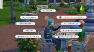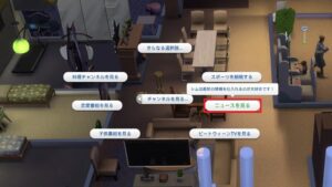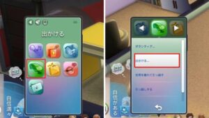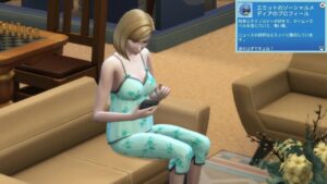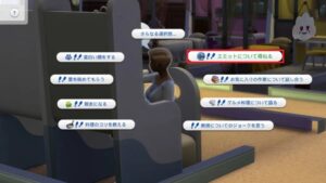 操作しているシム以外のシム(同世帯のシムも可)をクリックし、「エミットについて尋ねる」を選択します。