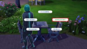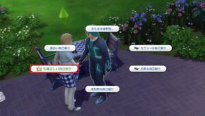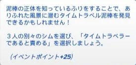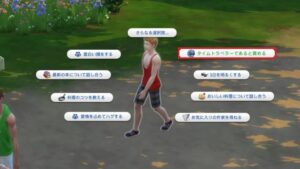 操作している以外のシム(同世帯のシムも可)をクリックし、「タイムトラベラーであると責める」を選択します。