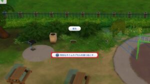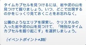 公園などで、岩や泥の山を見つけてクリックし、「特別なタイムカプセルを掘る」を選択します。掘り終えるとクエストはクリアとなります。
