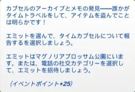 エミットに会って、「タイムカプセルについて報告する」を選択すれば、クエストはクリアとなります。