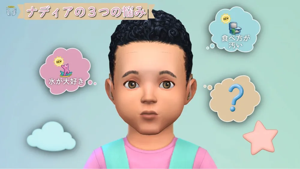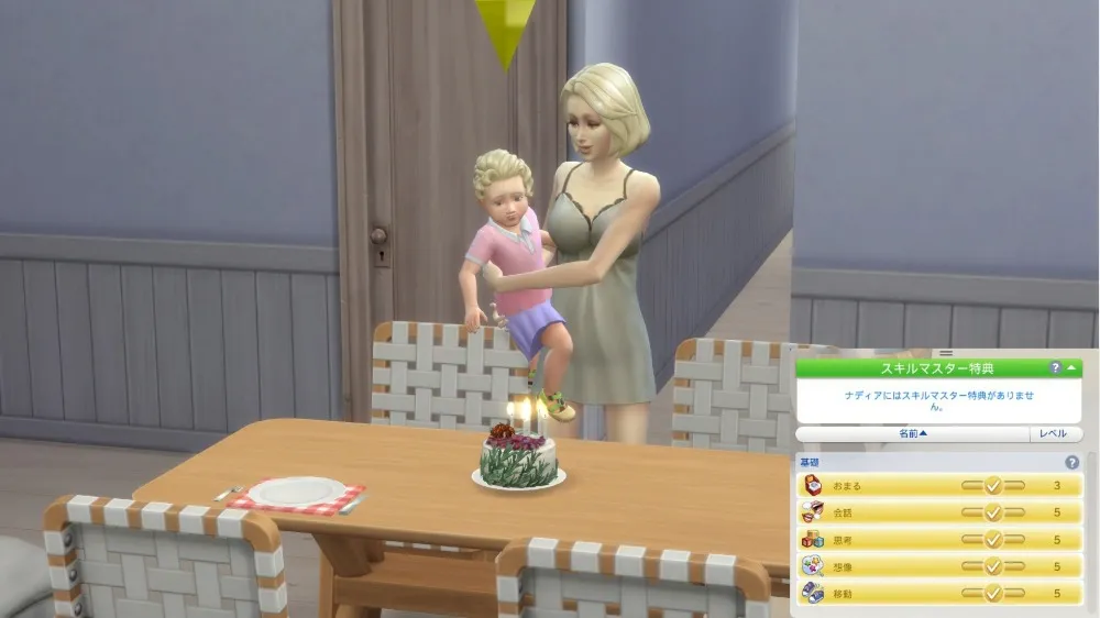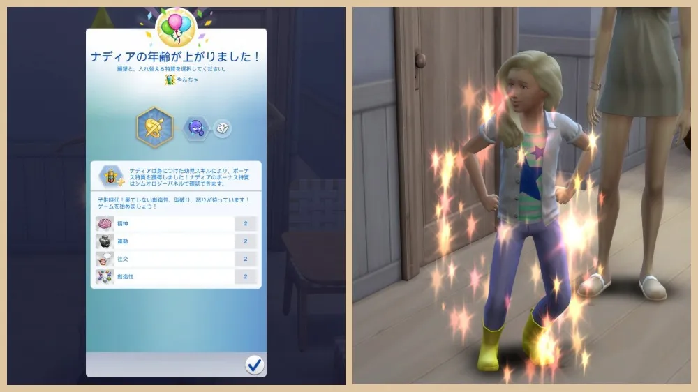 ナディア:幼児→子供に成長。願望は「天才芸術家」、特質は「練習あるのみ」
